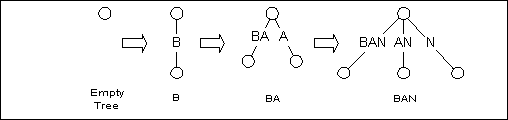 tree, then BA, then BAN, and so on. When BANANAS is finally inserted, the tree