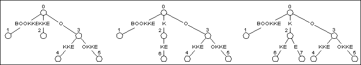 When adding BOOKKE to the tree in Figure 5, we once again start with the longest suffix, BOOKK, and work our way to the shortest, the empty string. Updating the longer suffixes is trivial as long as we are updating leaf nodes. In Figure 5, the suffixes that end in leaf nodes are BOOKK, OOKK, OKK, and KK. The first tree in Figure 6 shows what the tree looks like after these suffixes have been updated using the simple string extension.