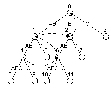 The suffix tree for ABABABC with suffix pointers shown as dashed lines