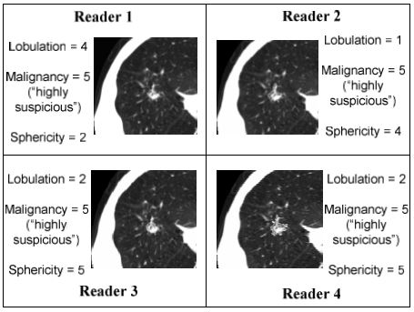 Figure 5: Visual representation of the LIDC data structure; one nodule is exemplified through the differences in the nodule’s outlines and semantic ratings.