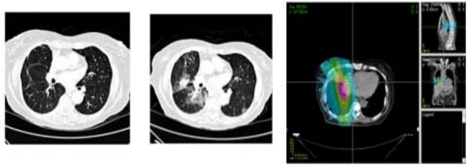 Figure 2: (left) Baseline CT scan from a lung cancer patient undergoing radiation therapy. (center) The same CT section after radiation therapy demonstrating normal lung tissue damage. (right) The radiation dose map from a different patient. The expectation is that regions of increased normal tissue damage correspond with regions of higher radiation dose.