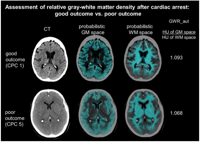 Figure 4: Tissue specific decomposition of a native CT to determine GWR in global cerebral hypoxia. Automated probabilistic assessment of gray matter (middle column) and white matter (right column) in computed tomography (left column): GWR’s in two patients resuscitated after cardiac arrest with good outcome versus poor outcome (lower row). This image comes from the paper by Hanning et. al.